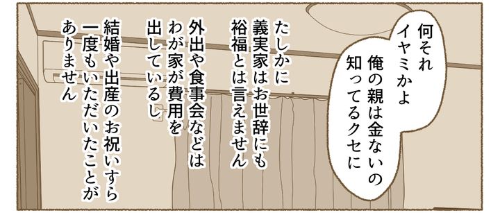 義実家はお世辞にも裕福とは言えず、日々節約をして暮らしているため、お祝いをもらったことがありません。先日夫と義母が出かけたときだって、支払いはわが家です。