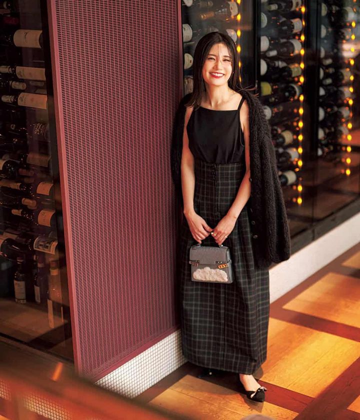 Cardigan : DES PRÉS、Camisole : Theory、Skirt : Drawing Numbers、Bag : DELVAUX、hoes : JIMMY CHOO、Earrings : Dior、Ring : MIKIMOTO