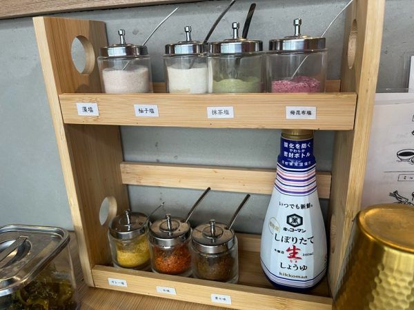 天ぷらすずきで嬉しいのが卓上にある調味料の数々。 塩や七味などで好きな味で天ぷらを楽しめます。