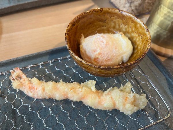 最初に出てきたのが、海老天ぷらと半熟玉子天ぷら。 この半熟玉子天ぷらは、ごはんの上にオンしていただくのですが…