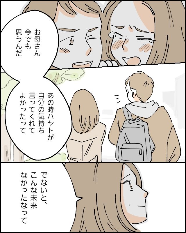 「お母さん、今でも思うんだ。あの時、ハヤトが自分の気持ちを伝えてくれてよかったって。でないと、こんな未来なかったなって」私がそう呟くと、