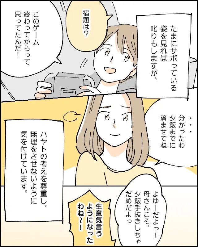「宿題は?」と聞くと、「このゲーム終わってからって思ってたんだ!」と答えるハヤトに、「・・分かったわ。夕飯までに済ませてね」と伝えた私は、ハヤトの考えを否定せず受け入れることに。