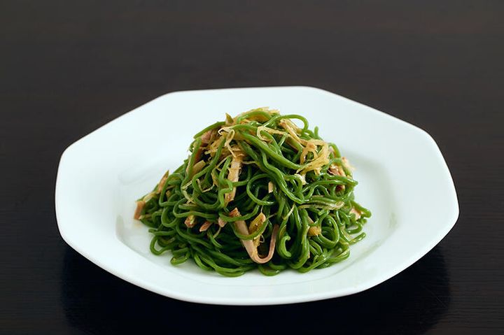 また、締めに外せないのはやはり“里麺(リーメン)”。幡ヶ谷「龍口酒家」の名物で、その流れを汲む「膳楽坊」でも人気のメニューだった一皿だ。緑の麺はクロレラ入り。具は千切りのチャーシューと長ネギ、搾菜と至って素朴。それだけに麺のゆで加減、締め加減、そして和え加減がポイントとなる。