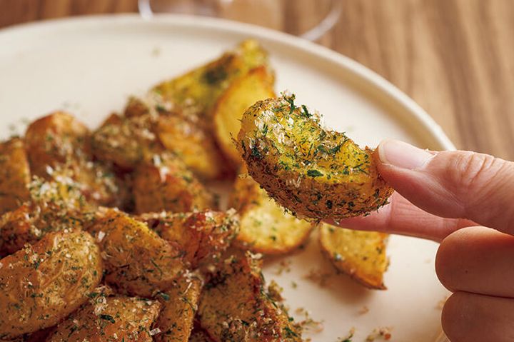 ザクッと手割りした凸凹の断面に、青海苔と「追い鰹」と称する鰹節がよくからみ、止まらないおいしさ。だしで煮て、芋の旨味を底上げしておくのが最大のポイント。