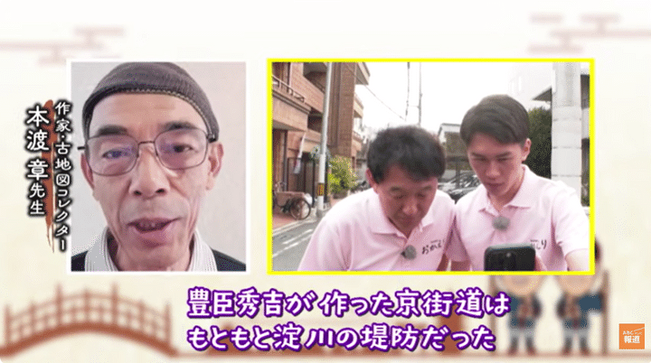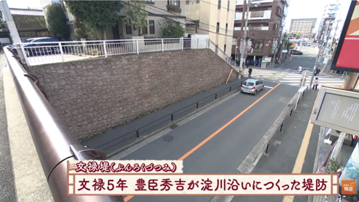 すると、驚きの事実が判明。実はここ、文禄5年に秀吉が淀川沿いに作った「文禄堤」という堤防の跡。当時は全長20km以上もありましたが、現在残っているのは700mほどで、その貴重な場所がまさに今、2人がいるあたりだったのです。