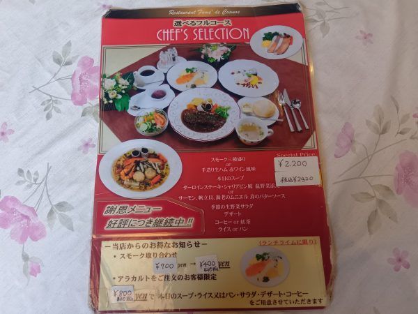 ★選べるフルコース オードブル・スープ・メイン・サラダ・デザート・ドリンク・ライスorパンと、計7種の豪華コースが楽しめるんです♪ とっても本格的で充実したランチですが、謝恩メニューにつきスペシャルプライス、なんと驚愕の2,420円! これはもう頼まないわけがありません。次々とご紹介しますよ〜。