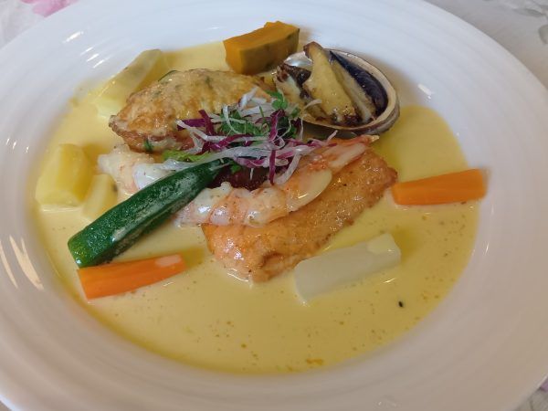 「サーモン、帆立貝、海老のムニエル 茸のバターソース」 同伴者が選んだ、サーモンに帆立貝、海老のムニエルのメインも豪華! 素材の味に、やさしくあまい茸のバターソースがとけて、とってもコク旨♪ アワビに似たトコブシもあり美味しさ倍増です。