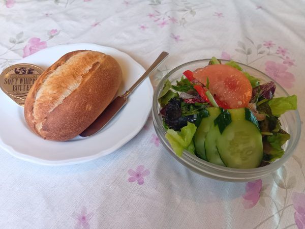 ★季節の生野菜サラダ ★パン シャキシャキのフレッシュサラダに、ライスかパンを選べるのでパンをチョイス。焼き立ての香ばしいパンは、外はカリッと、中はふんわりで、これだけでも美味しい〜。