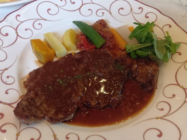 ★選べるメイン 「サーロインステーキ シャリアピン風 温野菜添え」 こちらもボリュームたっぷり♪ ステーキの柔らかさと旨味、そしてシャリアピンソースのコクがとけて、たまらない美味しさ。カボチャやオクラ、ニンジンなどの温野菜も種類豊富で、これまた嬉しいですね!