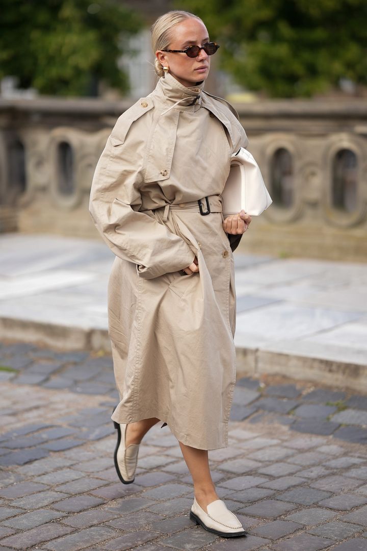 ハイネック、ベルト、フラップなど細部へのこだわりが光るトレンチコートは、フロントをぴったりと閉じてロングワンピース風に取り入れるのも◎。さりげない脚見せで抜け感を纏って。
