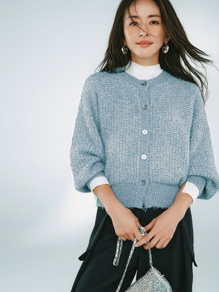 顔周りがパッと華やぐ、絶妙なキレイ色ニットカーディガン。ラメ混のミックスニットが、暗くなりがちな装いにさりげない華やぎをプラスします。寒い日はシャツやカットソーを重ねて、暖かくなったら一枚で主役に。軽アウター代わりにもなる肉厚感で、スマートに気温差調整ができます。