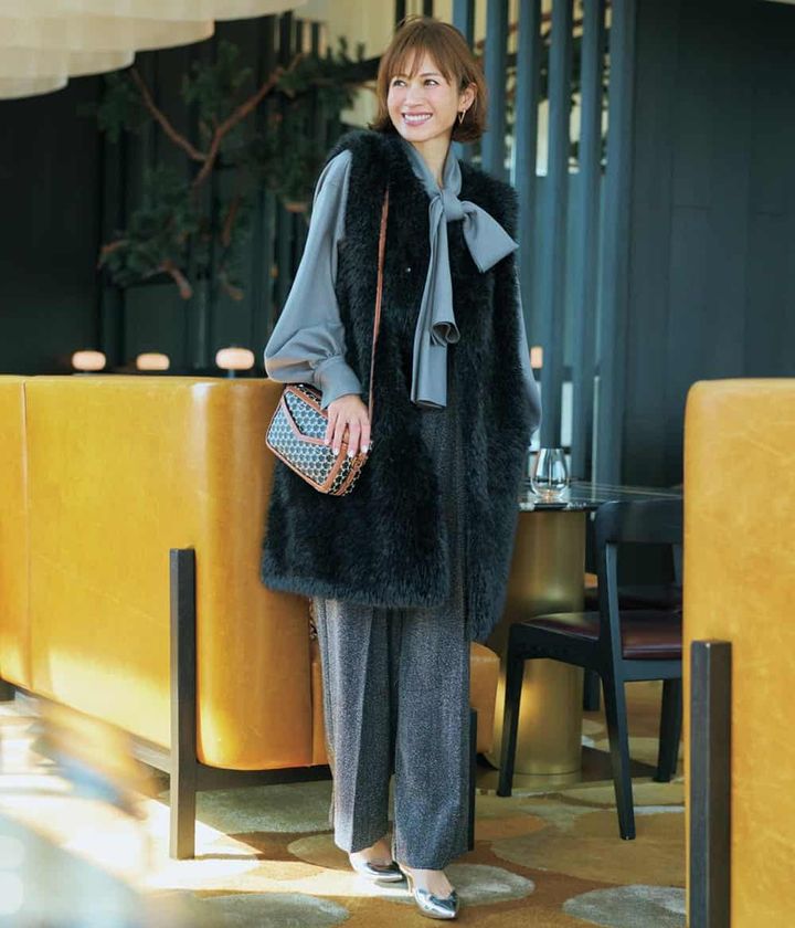 ブラウス¥19,910(ハッシュニュアンス/オンワード樫山 お客様相談室)ジレ¥69,300(ニアー ニッポン/ニアー)パンツ¥9,900(クロエンス/ワールド プレスインフォメーション)バッグ¥243,100(モワナ/モワナ 伊勢丹新宿店)パンプス¥66,000(ネブローニ)ピアス¥60,390〈参考価格〉(オーガスト)