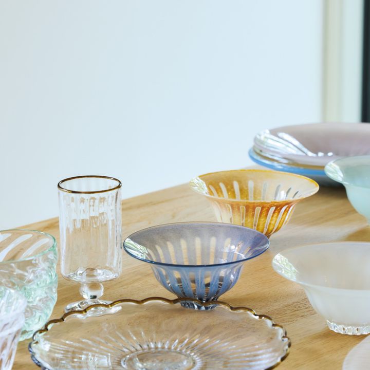 「ガラスの器というと“バカラ”や“ティファニー”のグラスのようにかっちりとして隙がなく、スタイリッシュな印象がありましたが、日本の吹きガラスを見て認識が変わりました。まるで飴細工のようにとろりと溶けそうで、やさしげ。パーティシーンならともかく、日々の食卓で使うのは断然、日本の作家物がいいなと思います」