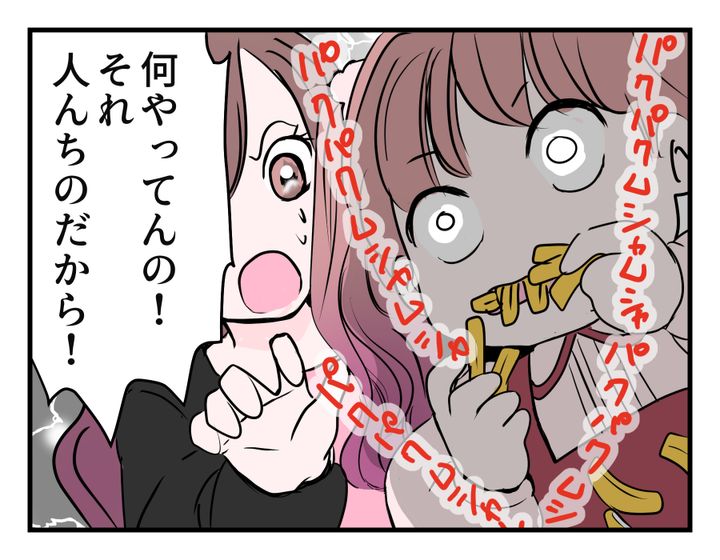 「大好きなフライドポテト、友達にもちょっとだけわけてあげよう」くらいに思っていたマユちゃん。まさか食べ尽くされてしまうなんて……! 思わず泣きそうになる気持ち、わかります。シオンさんはマユちゃんに申し訳なくて、ただひたすら謝るしかありません。一方のミチルさんは、娘をなだめなくてはと思いつつも、あまりに衝撃的すぎて気持ちが追いついていないようです。
