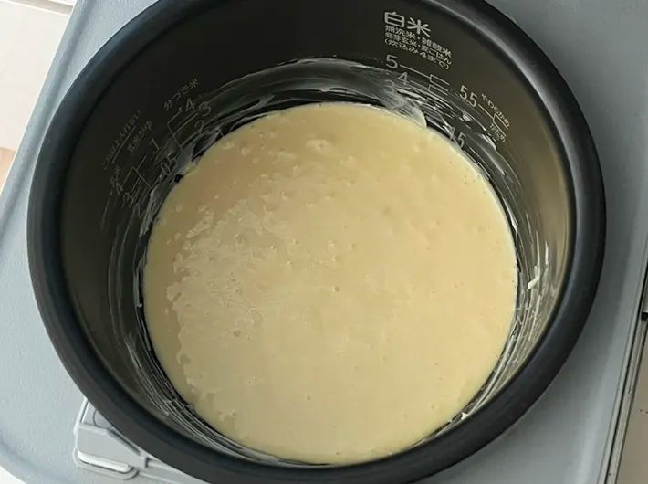 炊飯釜に生地を注ぎ入れ、炊飯器にセットします。