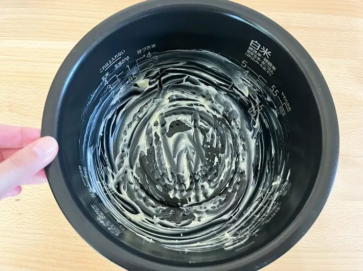 蒸しパンを外しやすくするため、炊飯釜の内側にバター、もしくは油を塗りましょう。