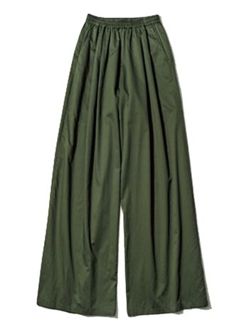深いグリーンの色みと2タックのワイドシルエットが作る、辛口でハンサムな佇まい。それでいてウエストはゴム仕様という、大人のわがままを叶える1本。ポプリン素材ならではのハリ・コシとシルクのようになめらかな表面を両立した上質なコットン100%。ラクをしているように見せない、それが「センスのいい人」のルール。