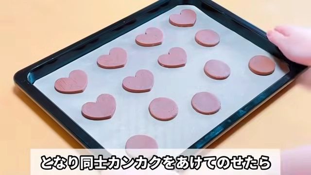 クッキングシートをしいた天板に、型抜きした生地をのせていきます。間隔をあけてのせてくださいね。生地が余ったらひとつにまとめてラップではさみ、同じようにまた麺棒で伸ばして型抜きします。