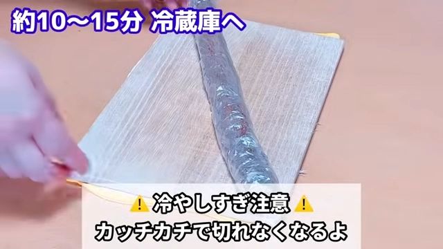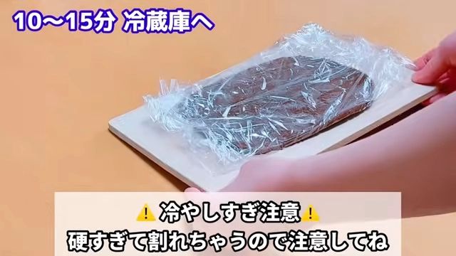 やわらかくてカットしにくいので、冷蔵庫で約10~15分冷やします。