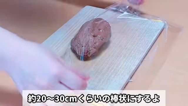 生地がまとまったらラップにのせ、20~30㎝の棒状に伸ばしましょう。