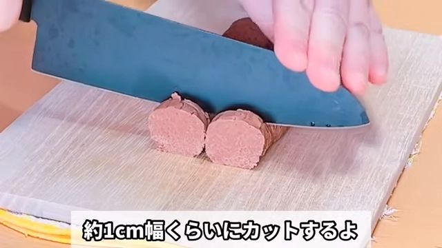 10~15分経って冷蔵庫から出したら、ラップをはずし約1㎝幅くらいにカットします。