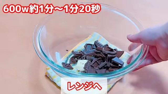 耐熱ボウルにバターと細かく割ったチョコレートを入れ、600Wに設定したレンジで約1分~1分20秒温めます。