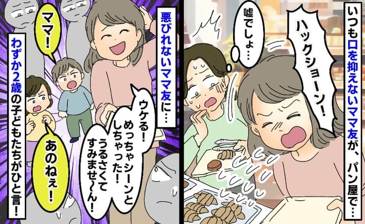 ある日、久しぶりに再会したママ友と子どもたちを連れてパン屋を訪れました。楽しい時間になると思っていたのですが、店内で突然ママ友のあるクセが発動。周囲が凍りつく中、子どもたちが放ったひと言で空気が一変します……。