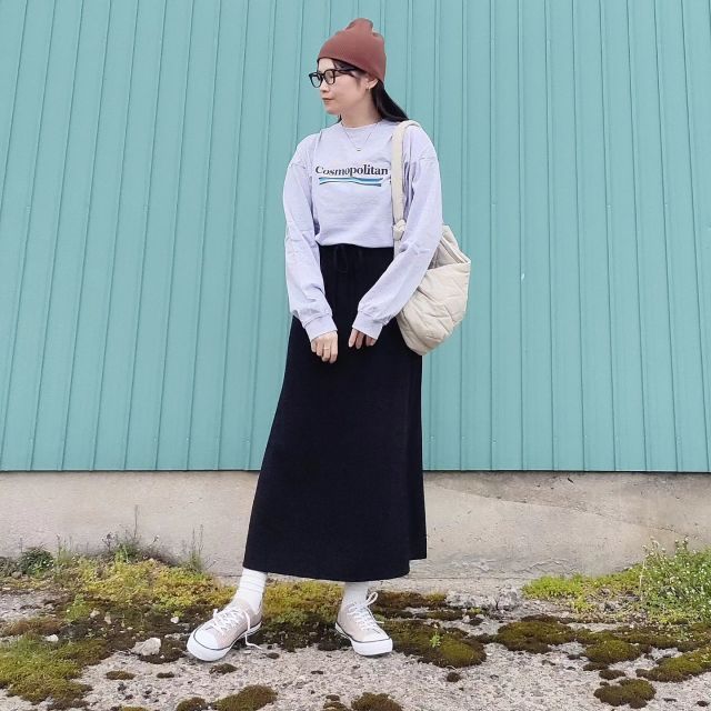 加えてスウェット生地やリブニット生地を選ぶのもおすすめ。ストレッチ性があるスカートならラクに過ごせますよ。
