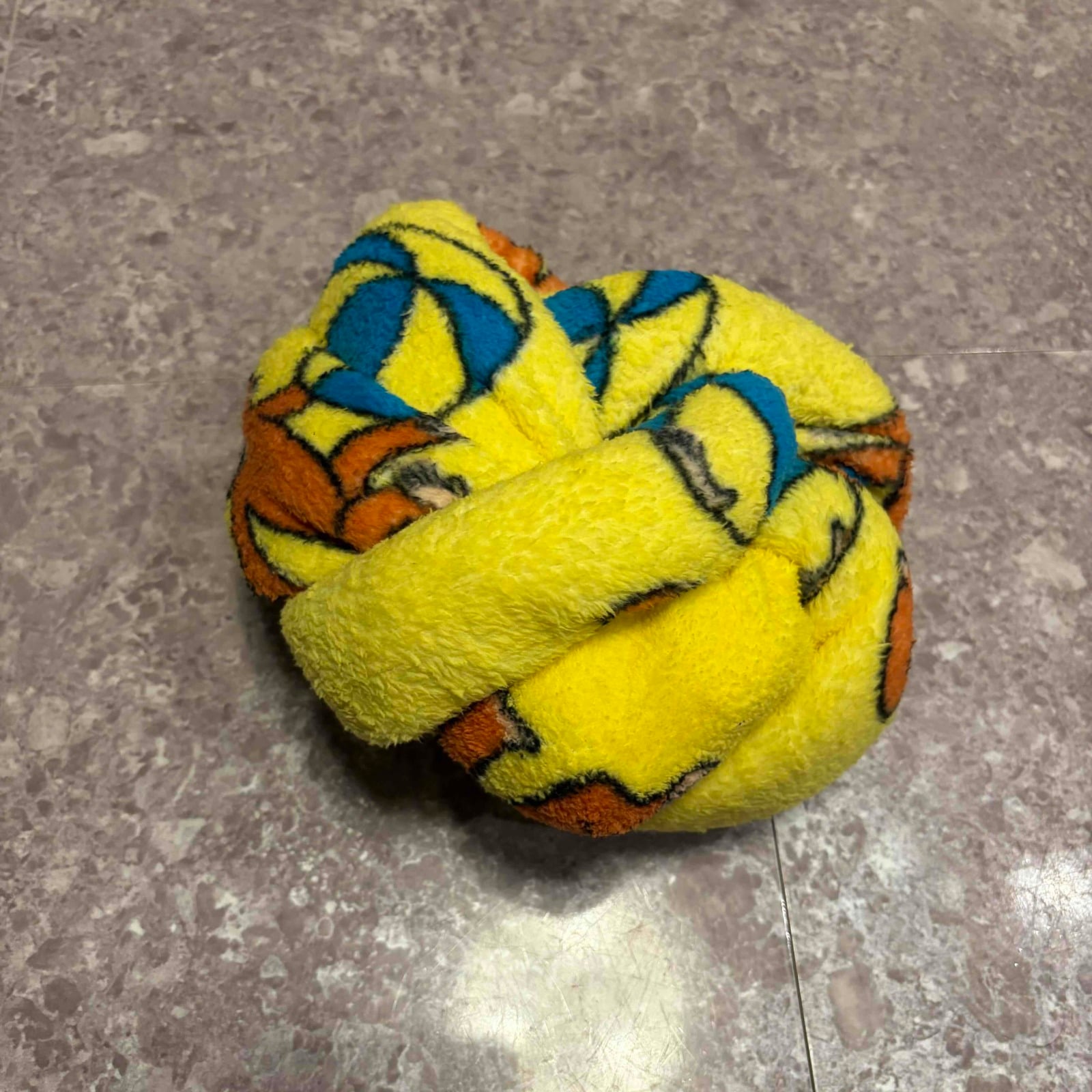 【4】短い方(結び目に近い方)の毛布の端を結び目の中に入れ込む