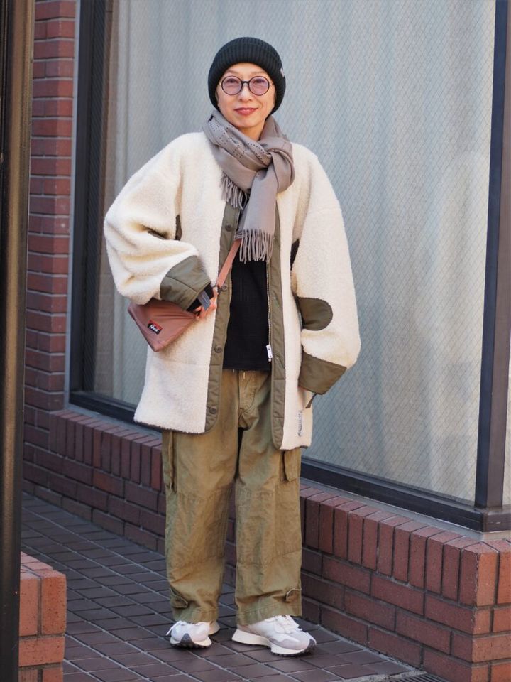 オーバーサイズのボアアウターをざっくり羽織り、メンズライクなアウトドアスタイルで表参道をぶらり。「ゆとりがあってリラックスできる洋服が好きで、メンズものを手に取ることが多いです。最近は息子の影響で『ミハラヤスヒロ』のアイテムに注目しています」。フランス製の軍パン、ニット帽、マフラー、グリーン系のアイテムをちりばめて統一感を出しつつ、ピンクのサコッシュでアクセントを。