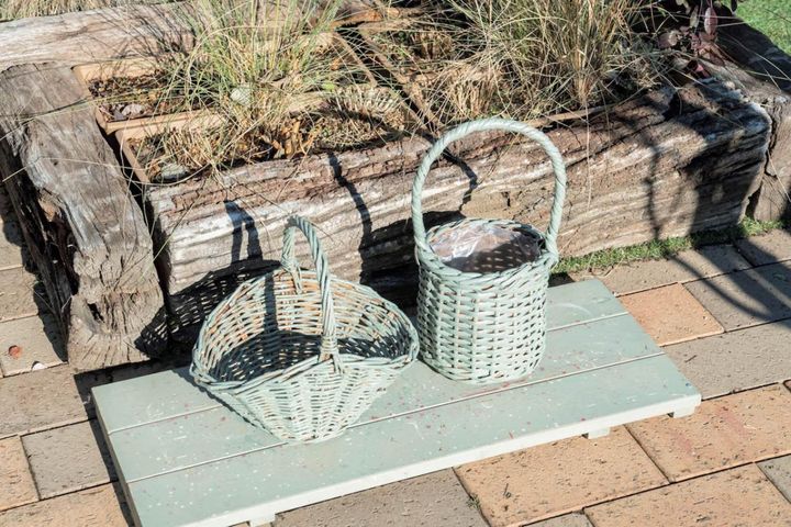 同じ色にペイントした2つのバスケットで魅力的なシーンづくり