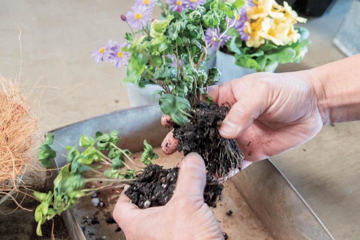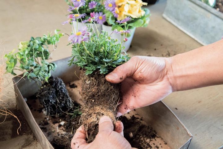 ローダンセマムをポットから出す。根が回っていたら、底の部分の根をやさしくほぐす。