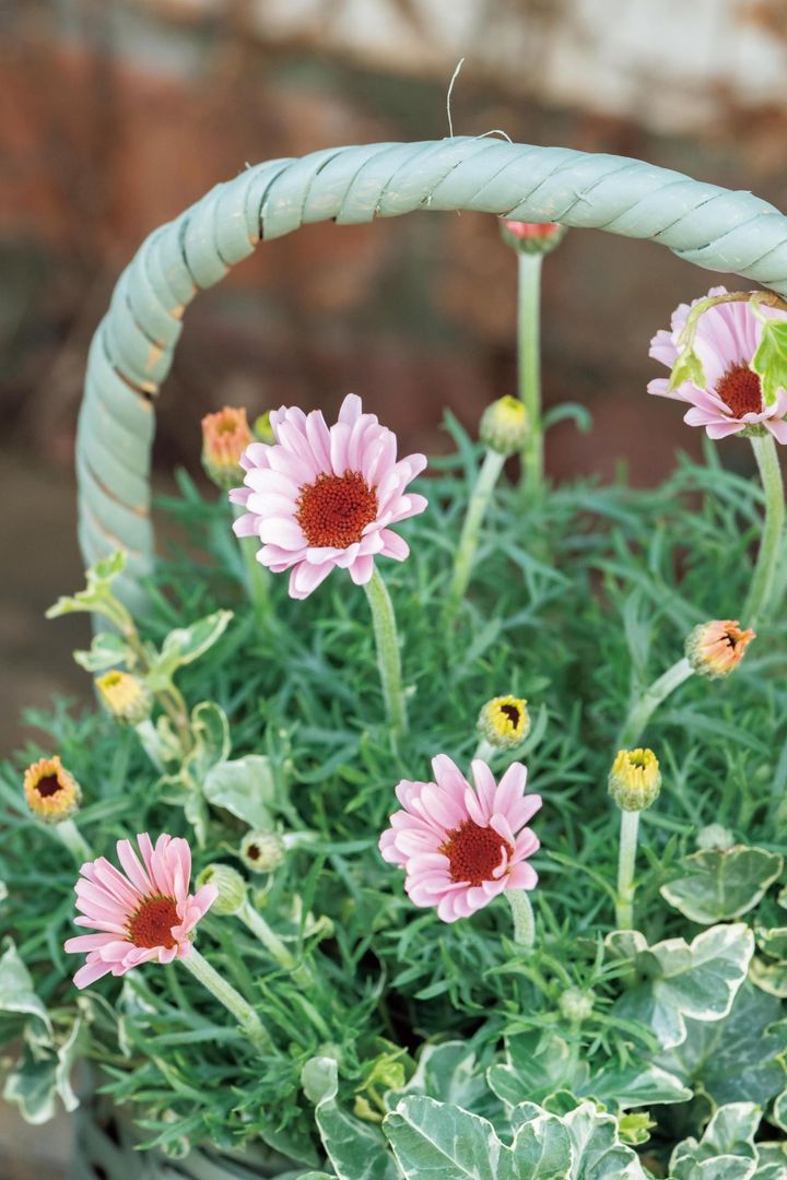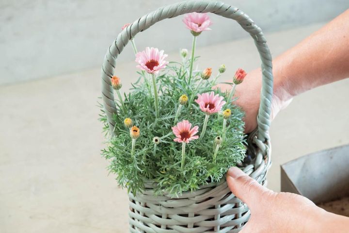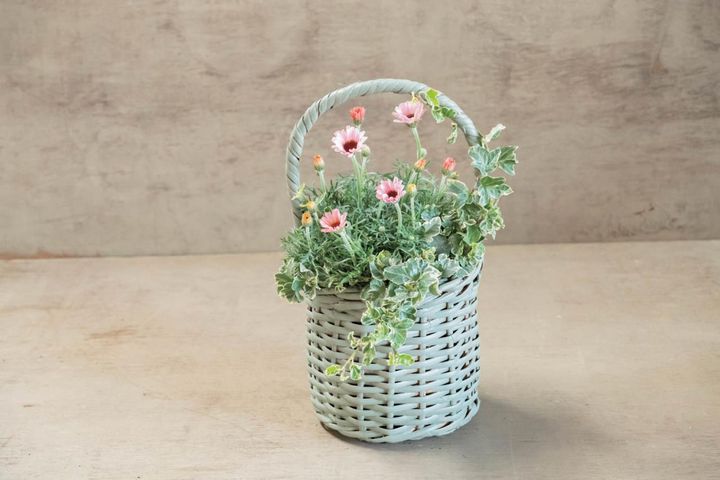 自然素材のバスケットはそのまま使ってもナチュラル感がありすてきですが、好みの色にペイントしてオリジナリティーを出すのも手です。冬は空気が乾燥していてペンキも乾きやすいので、トライしてみては。今回は形の異なるバスケットを同じ色にペイントし、キク科の別の花をメインに使って“雰囲気を寄せた”のがポイントです。2~3ポットのシンプルな寄せ植えでも、2つのバスケットをセットにして飾ると、洗練されたシーンがつくりだせますよ。