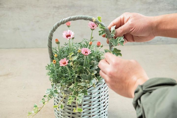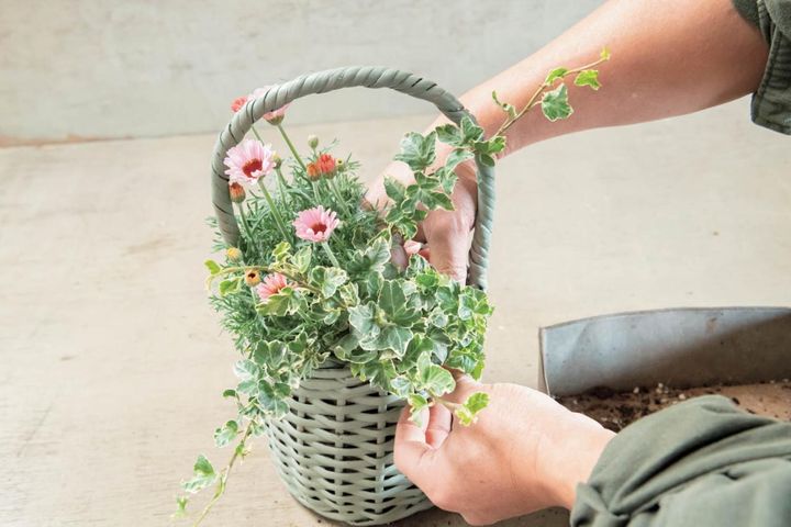 ヘデラの長いつるはバスケットの取っ手に絡ませると、より自然風に。