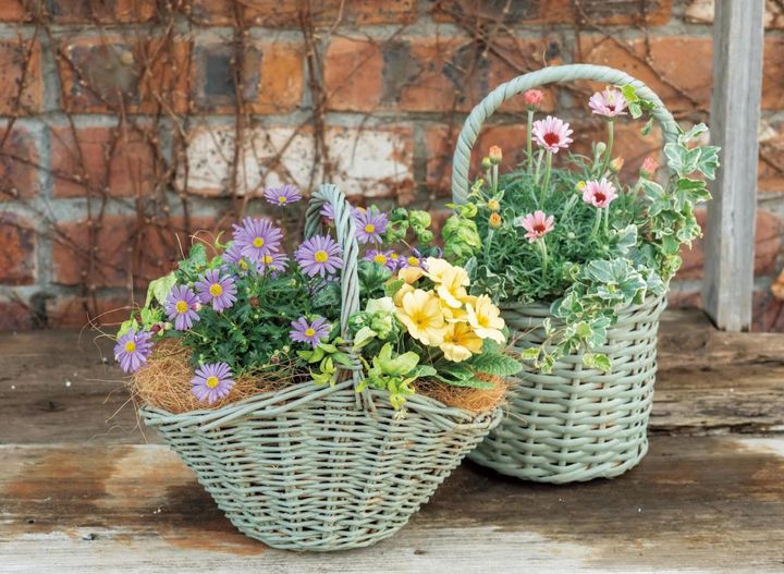 ペイントしたバスケットが乾いたら草花を植えて、2つのバスケットをセットで飾りましょう。