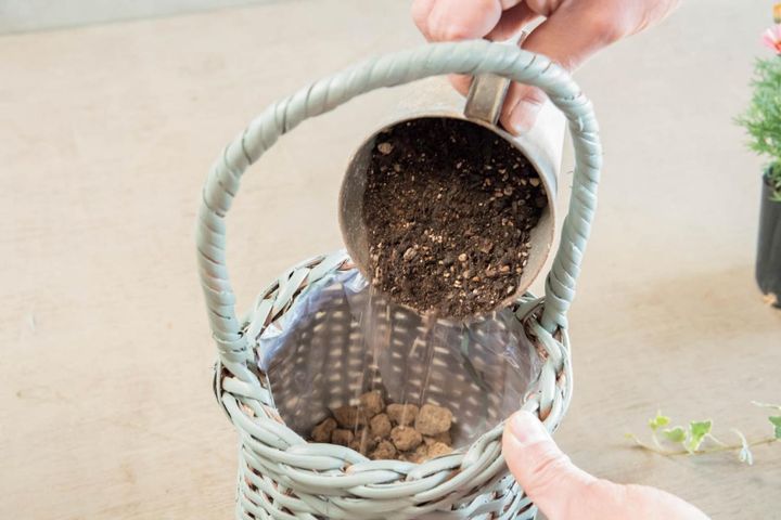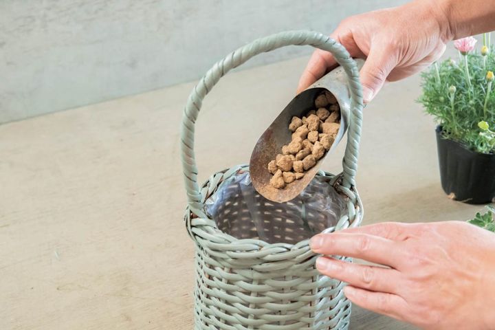 ゴロ土をバスケットの高さ1/5程度入れて、水はけをよくする。