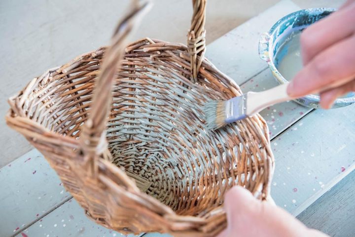 手軽に入手できる水性ペンキを使って、バスケットをスモーキーな色にペイントします。