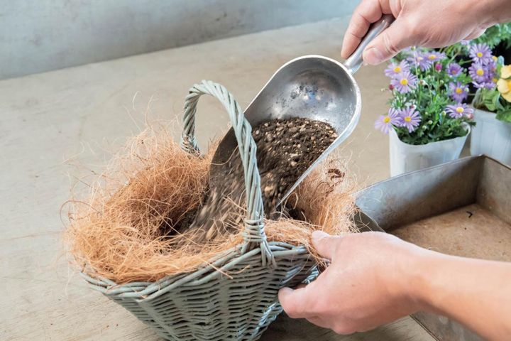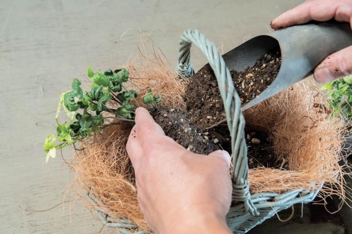 ココヤシファイバーを敷き詰め、上部は縁から少しはみ出させる。培養土をバスケットの高さ1/4程度まで入れ、緩効性肥料も規定量加えて混ぜる。