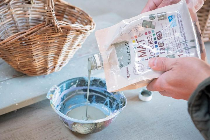 水性ペンキを器に移す。ペンキ専用の器を作っておくと繰り返し使える。