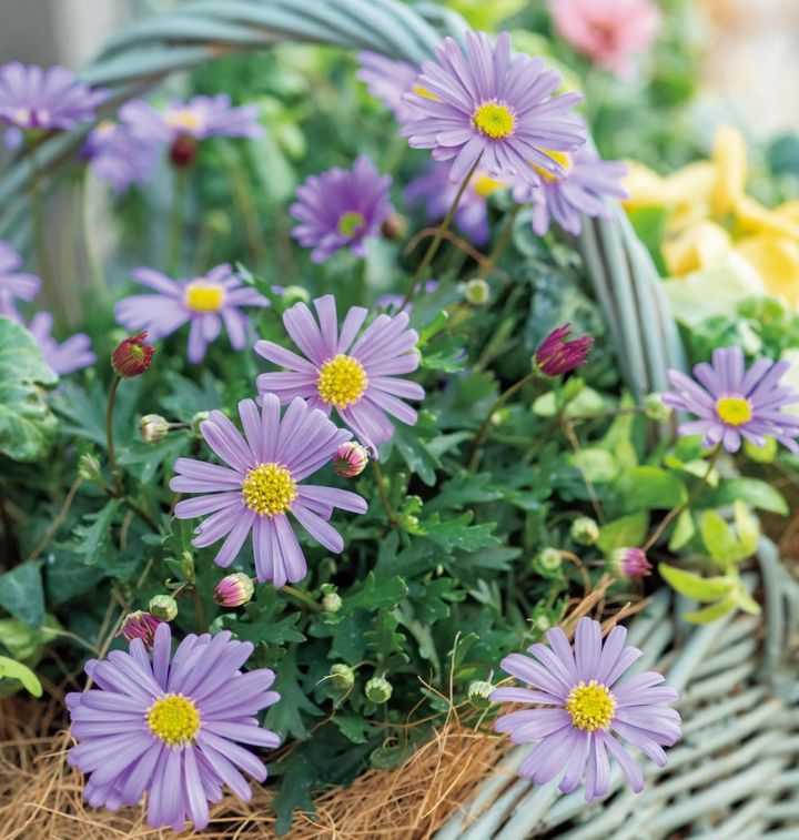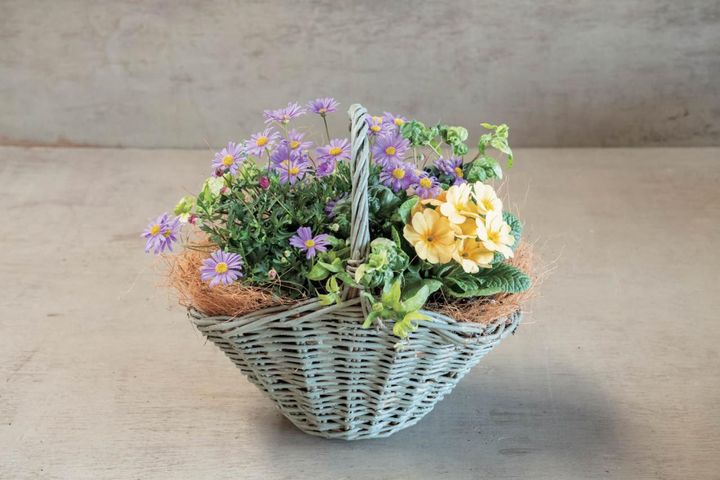 ブラキカムのパープルとプリムラ・ジュリアンのクリーム色がお互いを引き立てるバスケットが完成!