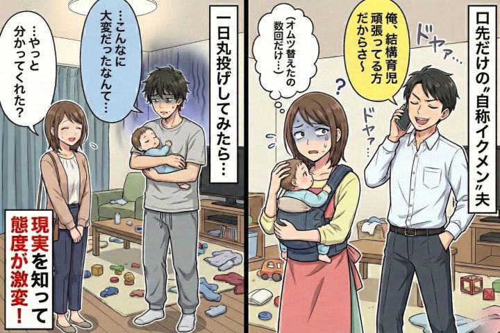 夫「俺、イクメンなんだよね~」子育てアピールが酷い夫→1日だけ子どもの世話を丸投げした結果