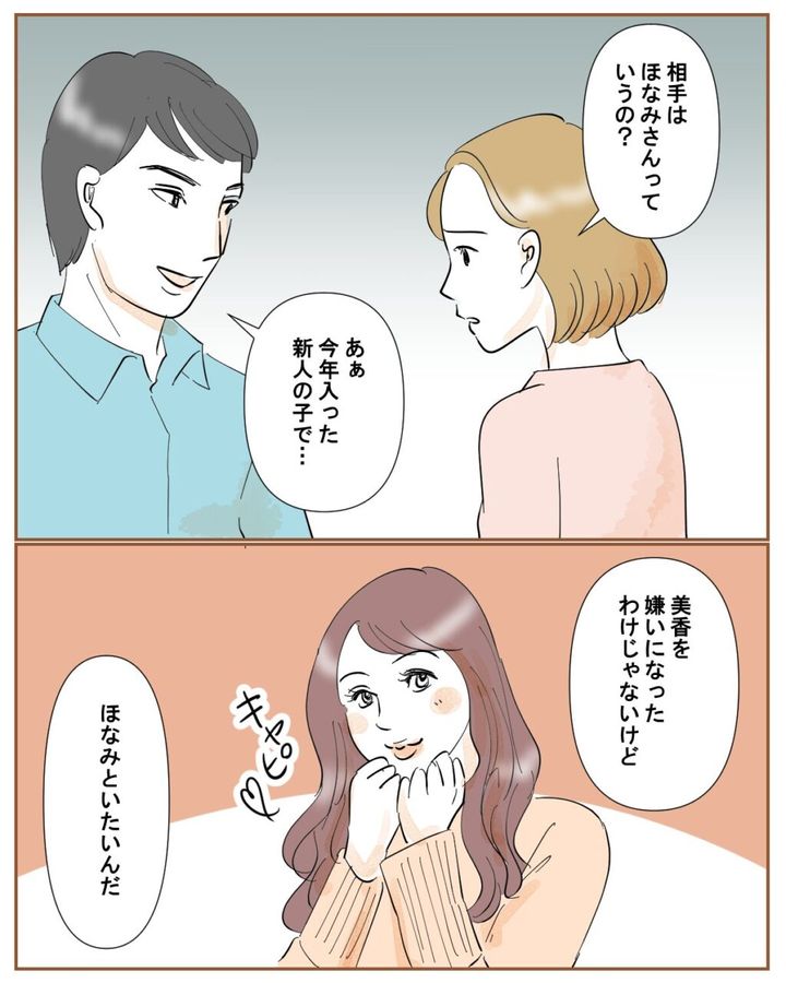 和也の相手は、今年入社したほなみさんという若い女性だそうです。ほなみさんと一緒にいたいと言う和也は、私のことを嫌いになった訳ではないと気休めにもならないことを付け加えました。