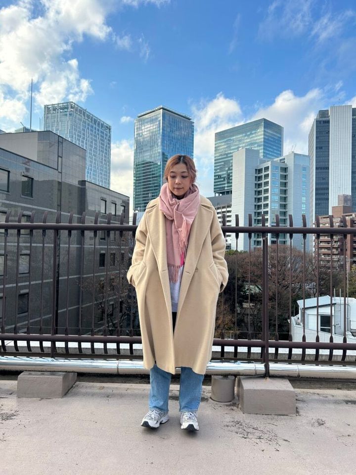 「デニムを使った定番スタイルですが、小物を使って大人めにシフト。Meryll Roggeのマフラーはジップが付いていて、上手に首元に巻けるので、冬の必須アイテムです。マフラーを目立たせたかったので、ほかのアイテムの色は抑えてまとめてみました。足元は、歩きやすさも抜群のNew Balanceのスニーカーをチョイス。休日のお出かけにぴったりのコーデです」(会社経営・原田美和さん)
