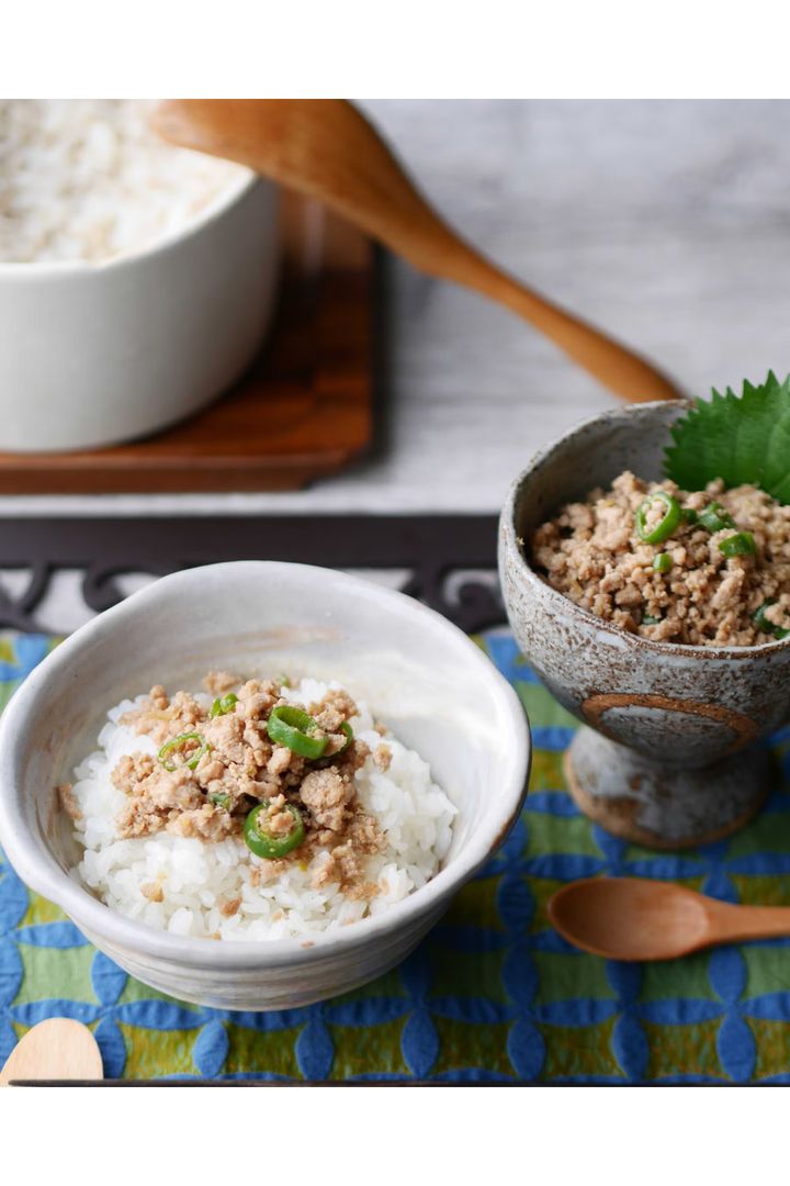豚挽き肉、青唐辛子、にんにくを一緒に炒めるだけで、ご飯がどんどん進むピリ辛いそぼろが完成。隠し味に味噌を入れることで、コクとうま味がぐっと増す。作り置きしておけば、お弁当にも使えそう。