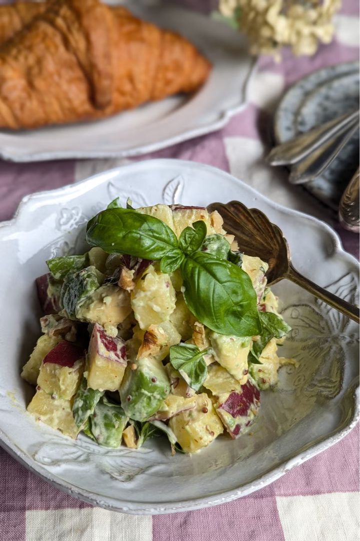 手軽でおしゃれなレシピにトライしたい気分の時には、旬のさつまいもとアボカドを使った簡単サラダはいかが? さつまいもは皮をむかずに角切りにしてゆでることで時短に。いものほくほく感に、生クリームを絡めたアボカドのねっとり濃厚な味わい、くるみの香ばしいさ重なり、リッチな味わいに仕上がる。