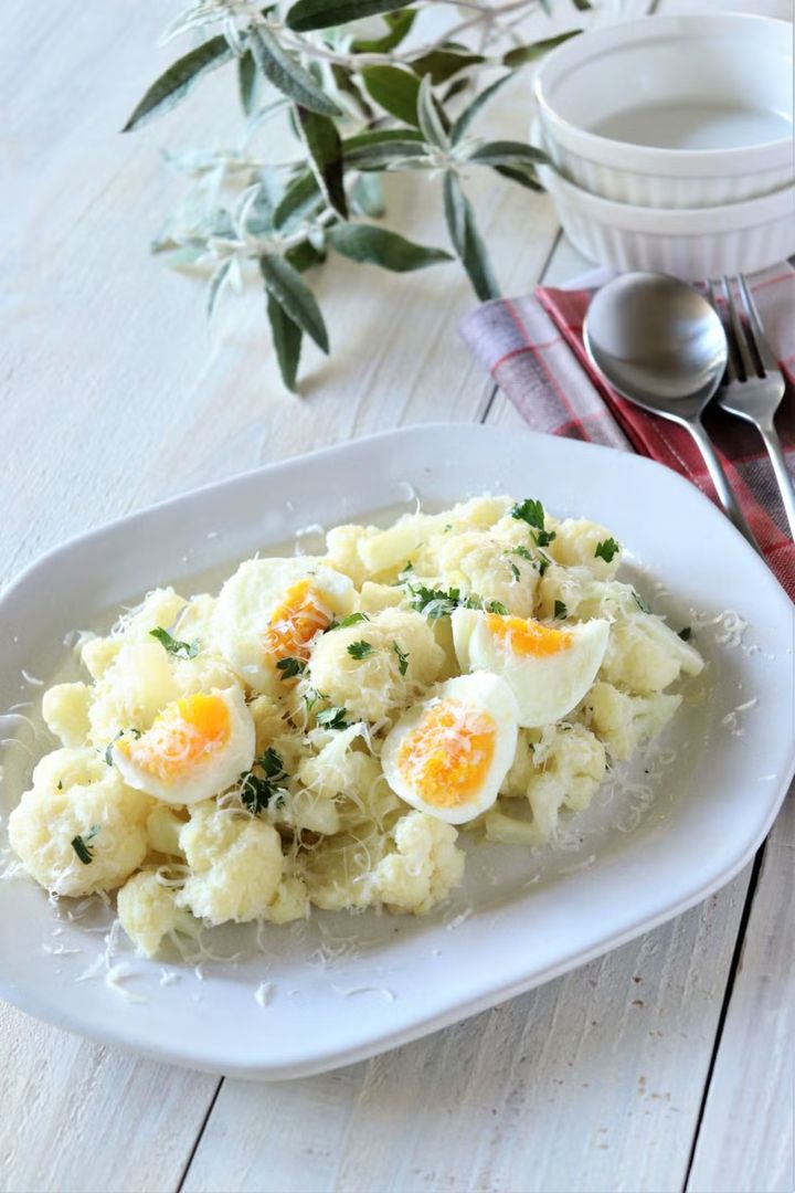 くったりと蒸し煮にしたカリフラワーをゆで卵と一緒に器に盛り、パルミジャーノ・レッジャーノとイタリアンパセリを散らせば完成。オリーブオイルとにんにくの香りをまとったカリフラワーは白ワインのお供にも◎。