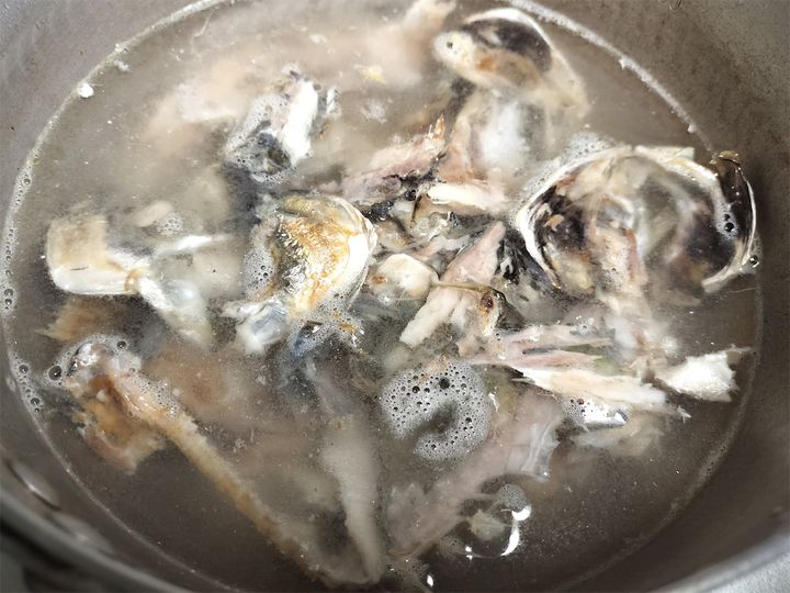2. 骨を鍋に入れ、ひたひたの水(分量外)、みりん大さじ1、酒大さじ1を加えて中火にかけてだしを取ります。