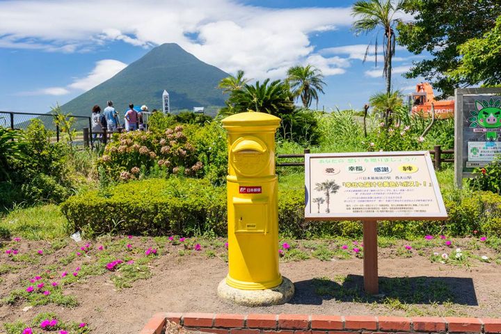 指宿の市の花である菜の花の黄色にペイントされた郵便ポストは、「幸せを運ぶポスト」として人気。
