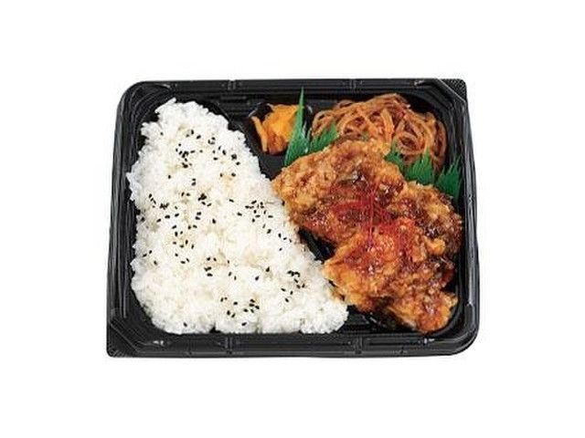 深みのある本格的な味付けの油淋鶏と、きくらげや春雨の食感が楽しめるピリ辛麻婆春雨を盛り付けたお弁当です。