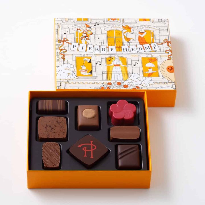パティスリー界のピカソと称され、独特の輝き、まろやかさ、芳香があるピエール・エルメ氏のショコラ。今シーズンは、シベリア杉の実のプラリネ「ショコラ オ マカロン アンフィニマン プラリネ ピニョン ド セドル」、サクサクとした食感のアーモンドとコーンのプラリネ「アンフィニマン プラリネ マイス」、ビターな宇治抹茶を使った「ショコラ オ レ エ テ マッチャ」、ベリーズ産のショコラガナッシュ「アンフィニマン ベリーズからなる4種の新作が登場。口の中でとろけて複雑なハーモニーを奏でる、上質なショコラを堪能できます。フランス在住のイラストレーター ジュリー・セール氏が描くユニークなシーンのイラストもキュート。